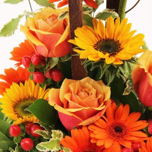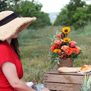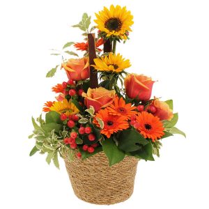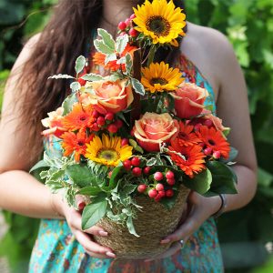 Notre composition Opale est une véritable explosion de couleurs dans les tons jaunes et oranges. Elle est composée de tournesols (selon la saison), de germinis oranges, de roses oranges en petits boutons ainsi que d’autres fleurs, le tout dans un contenant en osier marron foncé de forme ronde (le contenant peut varier en fonction des disponibilités).