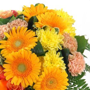 Ce bouquet de deuil est composé de chrysanthèmes, gerberas et roses dans les tons orange et jaune. Il est également agrémenté de feuillage et d’un ruban de deuil décoratif.