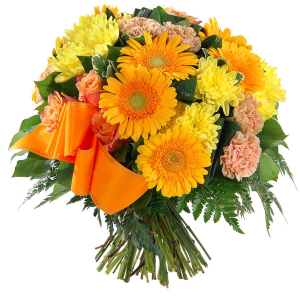 Ce bouquet de deuil est composé de chrysanthèmes, gerberas et roses dans les tons orange et jaune. Il est également agrémenté de feuillage et d’un ruban de deuil décoratif.