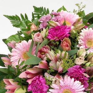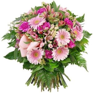 Offrez un magnifique bouquet de fleurs dans les tons roses pour exprimer vos sentiments à vos proches. Composé de gerberas, alstromerias, oeillets et autres fleurs de saison, ce bouquet apportera une touche de douceur et de tendresse à votre message.
