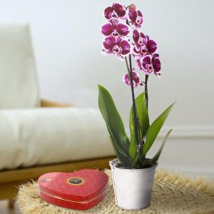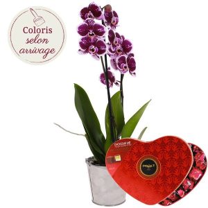 Offrez cette magnifique orchidée Phalaenopsis de 45-50cm de hauteur, avec ses 2 branches, dans son pot en zinc (la couleur de l’orchidée varie en fonction de l’arrivage). Un cadeau qui saura ravir les amateurs de fleurs et de chocolats.