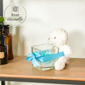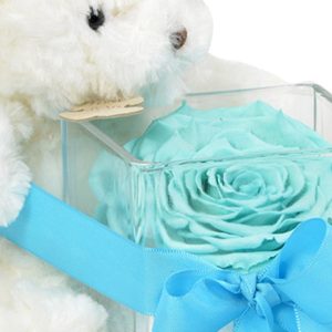 La saison nous suggère d’avoir la tête dans les nuages, et quoi de mieux que la rose bleue éternelle pour incarner ce sentiment ? Ce bouquet est composé d’une fleur bleue stabilisée, délicatement disposée dans un vase en verre carré, accompagnée d’un ourson en peluche Histoire d’Ours (15cm). Un duo parfait pour délivrer un message de tendresse et apporter une touche de douceur dans une chambre d’enfant ou en cadeau de naissance original.