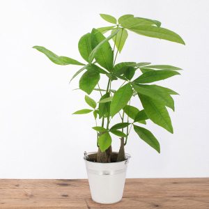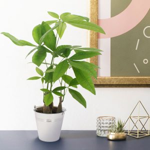 Originaire d’Amérique centrale et du sud, la Pachira est une plante dont les feuilles évoquent des mains vertes. Selon la doctrine chinoise du Feng Shui, elle est porteuse de bonheur et de fortune. Son tronc agit comme un gardien de trésor, conservant les bonnes énergies dans son pot en zinc rond.