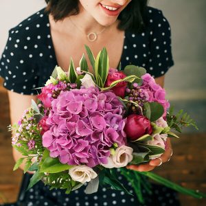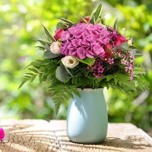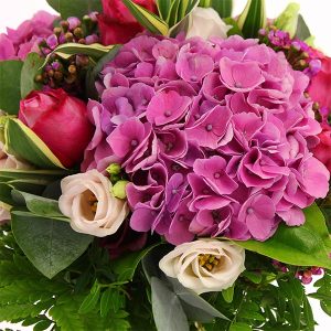 Composé d’hortensias roses, de roses fuchsias, de lisianthus et autres fleurettes de saison ainsi que de feuillage, ce bouquet évoque la douceur et la chaleur de l’été.