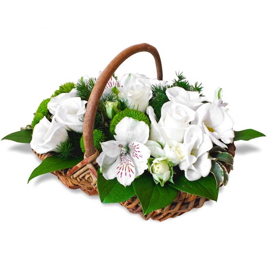 Ce panier de fleurs est un véritable bijou pour les yeux, avec ses belles nuances de blanc et de vert qui lui donnent un aspect à la fois doux et élégant. Agrémenté de subtils végétaux, il est idéal pour offrir en toute occasion.