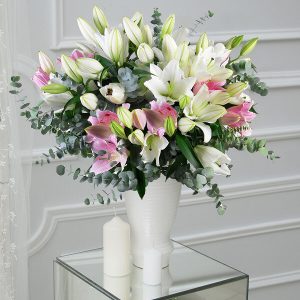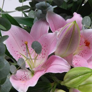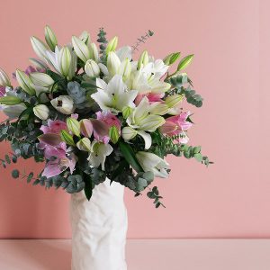 Ce bouquet rond, aux tons blanc et rose, est composé de lys et d’eucalyptus. Sa simplicité et son élégance en font un choix parfait pour toutes les occasions.