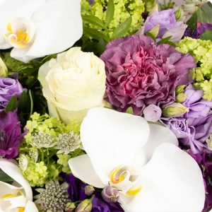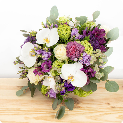 Ce magnifique bouquet est une véritable œuvre d’art, composé d’orchidées blanches élégantes, de belles roses et d’un assortiment de fleurs saisonnières dans des tons mauves, blancs et verts. Son feuillage finement travaillé lui confère une allure à la fois chic et champêtre. Parfum Sauvage est le choix parfait pour célébrer un événement important.