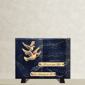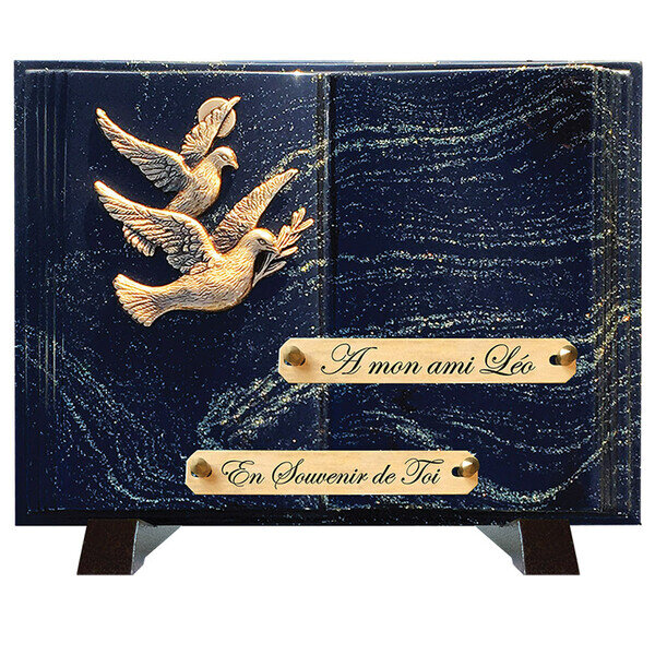 Cette plaque funéraire est composée de poudre de granit et est montée sur des pieds en aluminium. Elle a la forme d’un livre et est de couleur pailleté or. Le motif en bronze représente deux colombes. La plaque est livrée entièrement montée.