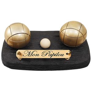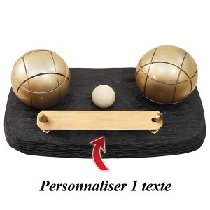 La plaque est ornée de boules de pétanque et d’un cochonnet en bronze, pour un rendu original et personnalisé. Ces motifs sont réalisés avec soin pour un résultat de grande qualité.