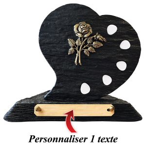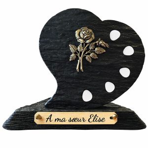 Cette plaque funéraire est composée de poudre de granit et dispose d’un socle. Elle mesure 14×2.2 cm et est livrée entièrement montée. Les motifs présents sur la plaque sont une rose en bronze et 5 galets blancs.