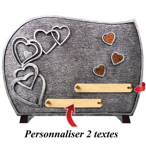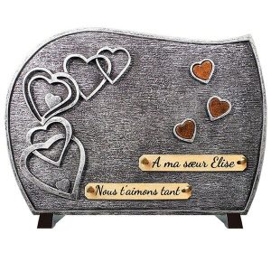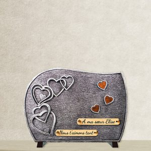 Cette plaque funéraire contemporaine est composée de bronze et repose sur des pieds en aluminium de couleur argent. Elle mesure 14×2.2 cm et est ornée de motifs en forme de galets et de cœurs en bronze. La plaque est livrée entièrement montée.