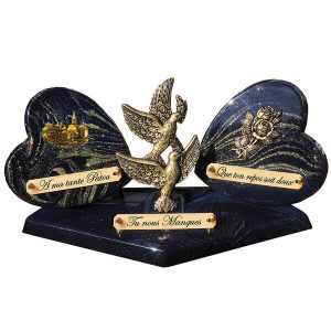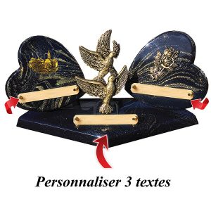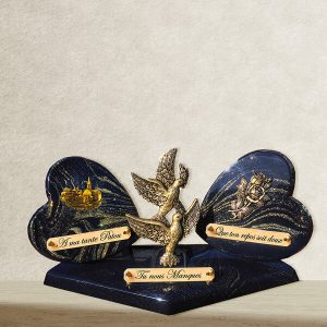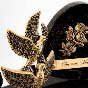 Cette plaque funéraire est composée de poudre de granit, lui donnant une apparence pailletée or. Sur son socle, elle est disponible en forme de cœur pour un hommage plus symbolique. Elle est également agrémentée de motifs en bronze représentant deux colombes, un village et des roses.
