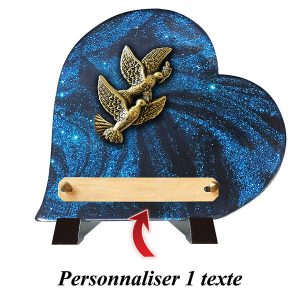 Cette plaque funéraire est composée de poudre de granit et dispose de pieds en aluminium pour une meilleure stabilité. Sa forme en cœur et sa couleur pailletée bleue lui confèrent une touche élégante. Le texte peut être gravé sur une taille de 14×2.2 cm et le motif en bronze représente deux colombes, symboles de paix et d’amour. La plaque est livrée entièrement montée pour une installation facile.