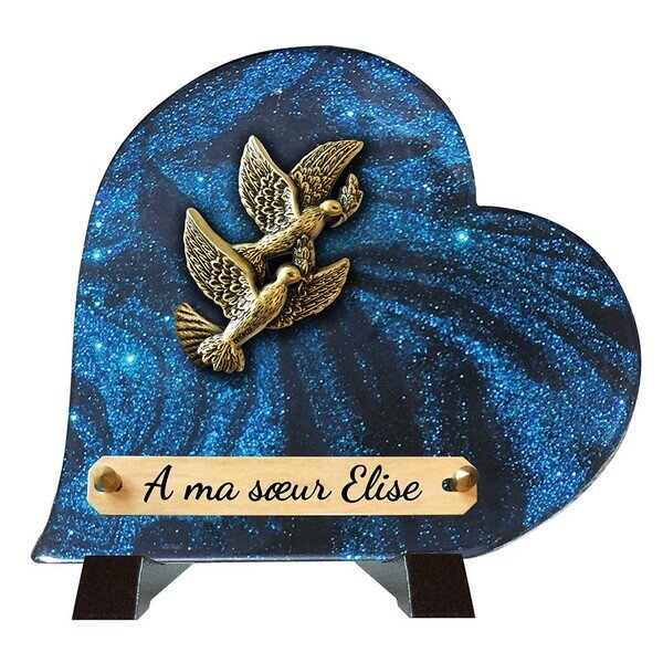 Cette plaque funéraire est composée de poudre de granit et dispose de pieds en aluminium pour une meilleure stabilité. Sa forme en cœur et sa couleur pailletée bleue lui confèrent une touche élégante. Le texte peut être gravé sur une taille de 14×2.2 cm et le motif en bronze représente deux colombes, symboles de paix et d’amour. La plaque est livrée entièrement montée pour une installation facile.