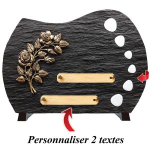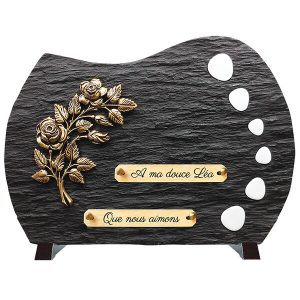 La plaque est ornée de motifs de roses en bronze et de galets blancs, symbolisant l’amour et la pureté.