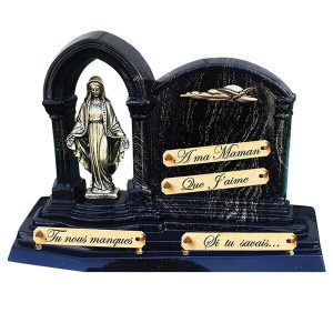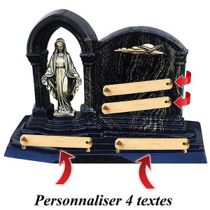 La taille du texte gravé est de 14×2.2 cm, ce qui permet une bonne lisibilité et une personnalisation selon vos souhaits. Les motifs en bronze représentent une vierge et une colombe, symboles de paix et de spiritualité.