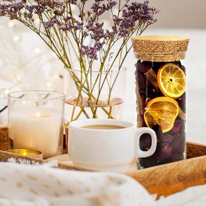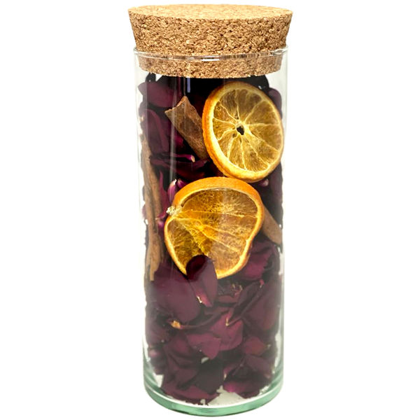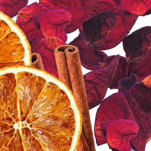 Pot en verre de fleurs séchées composé de pétales de roses rouges séchés, accompagné de 2 bâtons de cannelle et de 2 tranches d’oranges séchées.