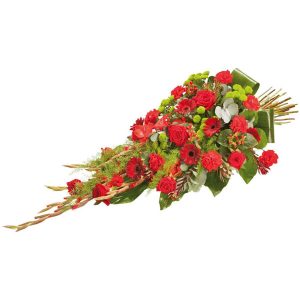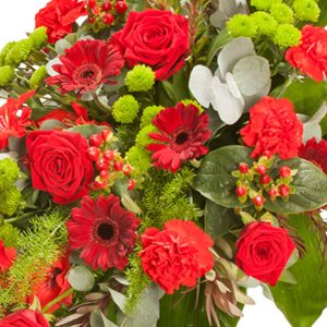 Cette gerbe est réalisée à la main avec soin, dans des tons rouges et verts. Elle est composée de glaieuls, de roses, d’hypericum, de germinis, d’œillets, de santinis verts, de leucodendrons, de salal, d’asparagus, d’aspidistras et d’eucalyptus. Chaque fleur est choisie avec attention pour créer un ensemble harmonieux et unique.