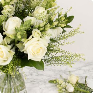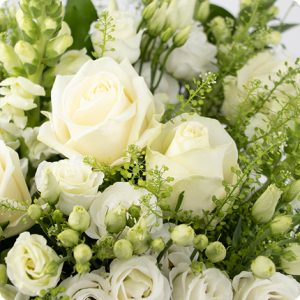 Ce superbe bouquet pour deuil est composé de magnifiques roses et de fleurs blanches de saison, sublimées par un feuillage travaillé avec finesse. Grâce à leur symbolique, ces fleurs offriront un message de soutien et de réconfort aux proches en deuil, et exprimeront avec élégance vos sincères condoléances.