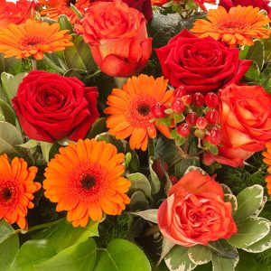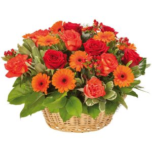 Cette composition funéraire est composée de germinis, de roses et d’autres fleurs de saison dans des tons rouge, orange foncé et vert. Le tout est présenté dans une vannerie sans anse (contenant non contractuel).