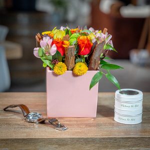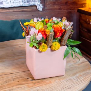Succombez au charme unique de cette composition florale originale et tendance proposée par notre réseau d’artisans fleuristes. Cette composition piquée dans les tons orange, jaune, vert et rose est composée de roses, alstromerias et autres fleurs de saison dans un contenant carré (le contenant peut varier en fonction des disponibilités).