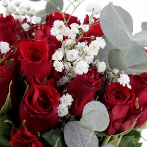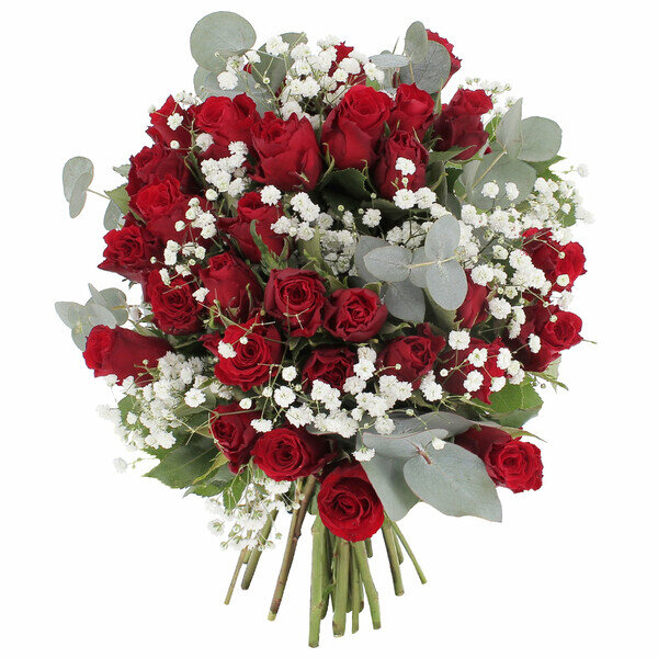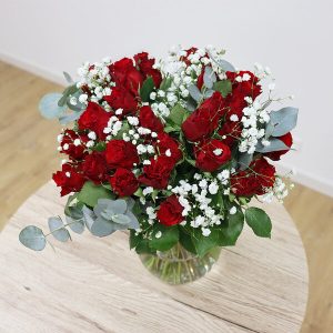 Ce bouquet harmonieux allie 30 roses rouges, du gypsophile et de l’eucalyptus pour créer une composition à la fois élégante et tendance. Idéal pour toutes occasions florales, il saura transmettre vos sentiments passionnés avec émotion.