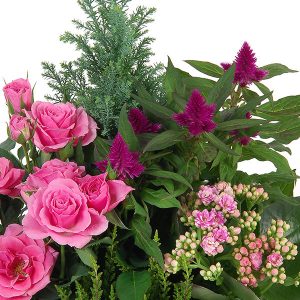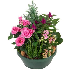 Cette coupe de plantes est un mélange harmonieux de roses et de fleurs de saison dans des tons rose et vert. Le tout est disposé dans une élégante coupelle, qui peut varier en fonction des disponibilités du fleuriste en charge de votre commande.