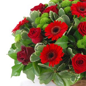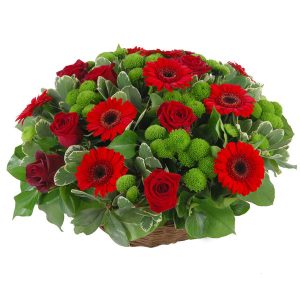 Cette composition de deuil est un bouquet harmonieux mêlant les couleurs rouge et vert. Elle est composée de roses, de germinis et de santinis, accompagnés d’un feuillage élégant. Le tout est présenté dans un panier avec de la mousse, pour une touche naturelle et raffinée.