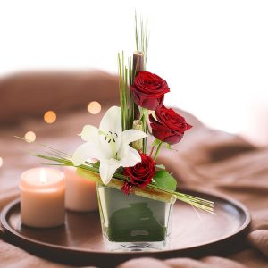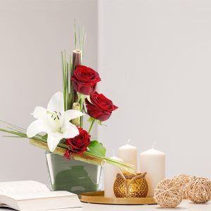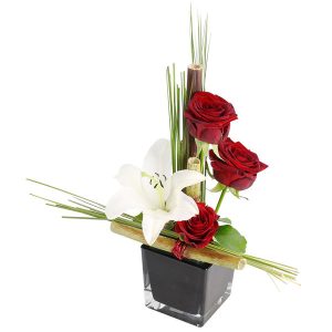 Ce bouquet est composé de roses, de lys et de feuillages dans les tons rouge et blanc, présenté dans un contenant. Le choix du contenant peut varier en fonction de la disponibilité du fleuriste en charge de votre commande.
