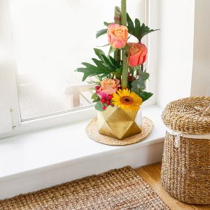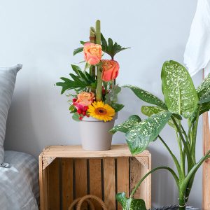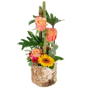 Cette composition en hauteur est réalisée dans des tons roses, jaunes et verts, à partir de roses, germinis et feuillages soigneusement sélectionnés. Le contenant peut varier en fonction de la disponibilité du fleuriste en charge de votre commande, ce qui en fait une création unique et personnalisée.