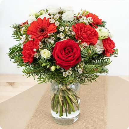 Le bouquet Santa est une création florale magnifique aux couleurs festives de Noël. Ses tons rouges et blancs apporteront chaleur et réconfort à celui ou celle qui le recevra. Composé de roses et de fleurs de saison, ce bouquet envoûtant est idéal pour offrir en cadeau.