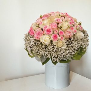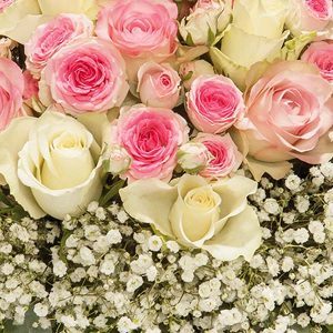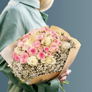 Cette composition florale est une véritable ode à la féminité et à la douceur. Les roses aux teintes pastel, d’une tendresse infinie, sont délicatement entourées d’un anneau de gypsophile qui sublime l’ensemble et lui apporte une touche de délicatesse. Ce bouquet rond est une création aérienne et sensible, idéal pour les occasions spéciales.