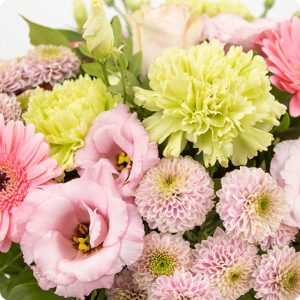 Ce bouquet raffiné et gracieux, composé avec soin par un artisan fleuriste local, est un assemblage de roses et de délicates fleurs de saison dans des nuances de rose et de vert. Il est idéal pour exprimer votre soutien doux et réconfortant envers un proche en deuil.