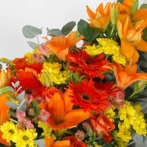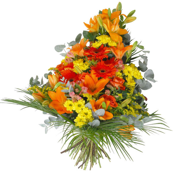 Cette gerbe de fleurs est composée de lys, de gerberas et de roses dans les tons rouge, orange et jaune. Elle est accompagnée de feuillage pour un effet encore plus naturel.