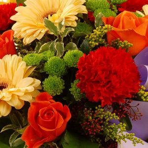 Dans les tons rouge et orange, ce bouquet est composé de roses, germinis, œillets rouges et autres fleurs, agrémenté d’un nœud mauve.