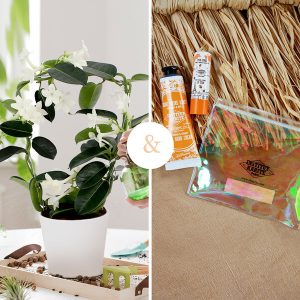 Le duo comprend un Stephanotis, une fleur au parfum envoûtant, dans un pot en céramique. Il est accompagné d’une trousse de beauté de la marque Institut Karité composée d’une crème pour les mains à l’amande et au miel de 30 ml ainsi que d’un stick à lèvres à la cire d’abeille et au karité.