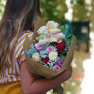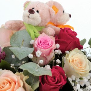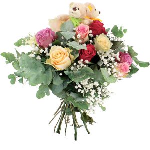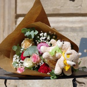 Notre bouquet Teddy est composé de 10 roses pastel, accompagnées de gypsophile et d’eucalyptus, pour un résultat délicat et raffiné. Les oursons en peluche ajoutent une touche d’innocence et de complicité à ce bouquet qui saura toucher les coeurs des petits comme des grands.