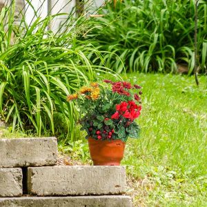 La composition “Témoignage” est une coupe de plantes d’extérieur dans les tons de rouge, jaune et vert, composée de chrysanthèmes et de plantes fleuries. Le contenant peut varier en fonction des disponibilités et les plantes en fonction des saisons.