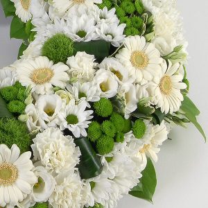 Découvrez notre couronne de deuil dans les tons blancs, réalisée avec soin et composée de germinis, d’oeillets, de lisianthus et d’autres fleurs de saison. Une création florale raffinée et délicate pour rendre hommage à un être cher.