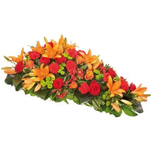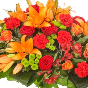Ce bouquet de deuil est composé de roses orange, de lys orange, de santinis verts, de roses rouges, d’œillets rouges, d’alstromérias rouges, de salal, d’aspidistra et de pittosporum. Ses tons orange, vert et rouge lui donnent une chaleur et une intensité particulière.