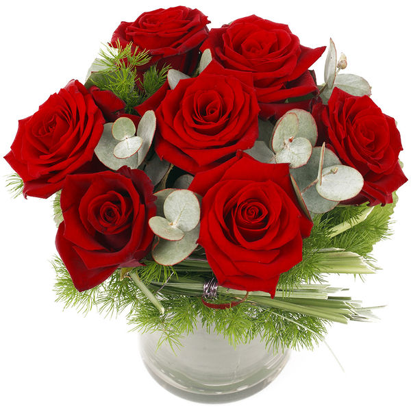 Composition piquée composée de roses rouges et feuillages dans son contenant. Le contenant peut varier en fonction de la disponibilité du fleuriste en charge de votre commande.